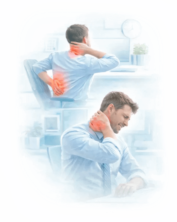For most office professionals, it develops gradually from a combination of factors — posture, prolonged sitting, workload, stress, and how the body adapts over time.